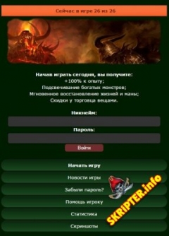 Описание: Привет всем)Нашел в инете двиг онлайн игры Coldwar установил себе вроде двиг ничего))Почистил таблы и решил закинуть) Установка ------------ 1) Залить базу bd.sql из папки backup 2) Прописать данные вашей бд в файле include/db.php 3) Поставить cron на include/coolwarik.php каждый час. Это очищаются логи боев, заявки на брак и обнуляется ежедневный бонус. 4) Найти своего персонажа в таблице users и прописать privilege=2