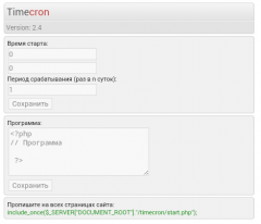 Описание: Timecron 2.5 ----- Эта версия немного поправалена: в админке написано, что инклудить. исправлены мелкие недочеты ----- О скрипте: используется для периодического выполнения заданий в определённое время, если выполнение программы не играет роли, пока результата не увидел посетитель. ----- Установка: 1) В файле adm_timecron.php изменить пароль от админки (по умолчанию - 0000). 2) Перейти в админку (ваш_сайт/adm_timecron.php) и настроить скрипт. ----- Код полностью прокомментирован. Первый старт будет спустя период срабатывания в указанное время после установки. ----- Автор: rekmixa Версия: 2.5