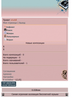 Описание: Обычный музыкальный загруз портал, написан мною(Kemel). Написан был еще в 2009 вроде году. Когда-то с Александром(TwoLove) открывали сайт на нем. Выкладываю т.к. давно им не пользуюсь и не собираюсь использовать.