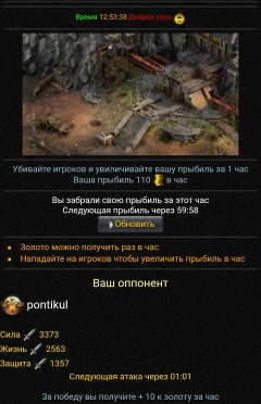 Описание: Битва за золото, крч в вас есть один бой за 10 минут, за победу вы получите 10к к прыбили за час, прыбиль вы можете забрать раз в час , на скрине все видно)
