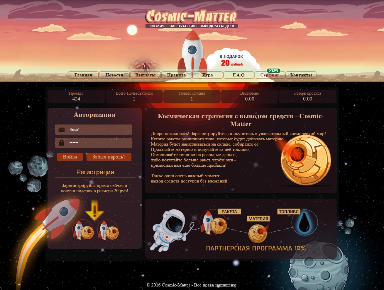 Описание: Скрипт новой онлайн игры Cosmic-Matter Качественный скрипт фермы в тёмных тонах на движке FF. Он имеет приятный дизайн, лёгкую установку, а также весьма понятный интерфейс. В архиве вы получите полную инструкцию по установке и на стройке платежек