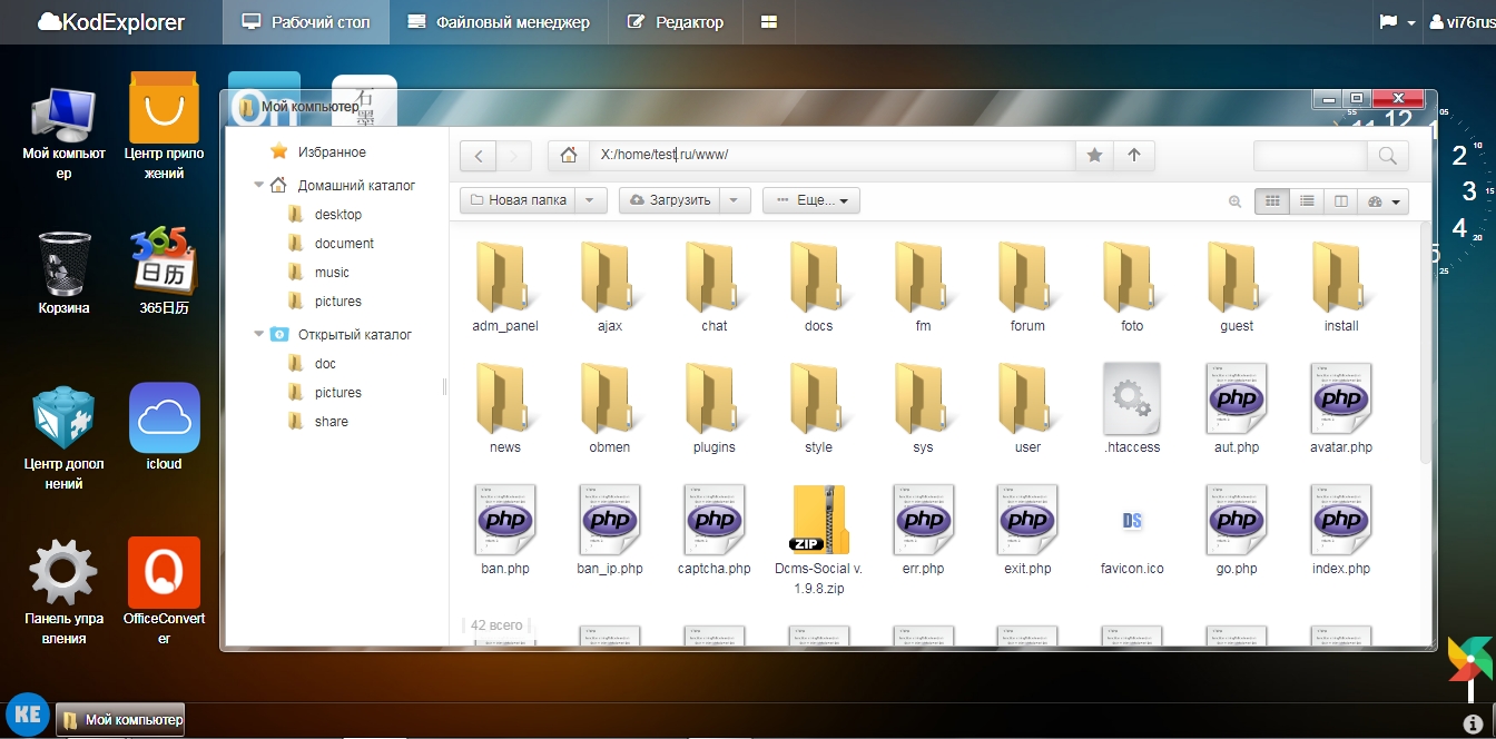Описание: KodExplorer - это система управления веб-документами. Вы можете использовать её для внутреннего или совместного управления документами, на сервере для управления сайтом, замены FTP, и даже webIDE для интерактивного режима разработки. Вы также можете интегрировать её в другие системы.