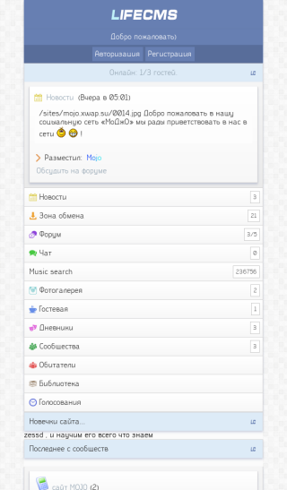 Вот бета версия лайфа, я зделал выводы на главную, форум,группы, новости. Добавил: юзер+ приветствие и роздел музыки. Сменил файл foot теперь он выглядит по другом и всего по мелочам. Пример: