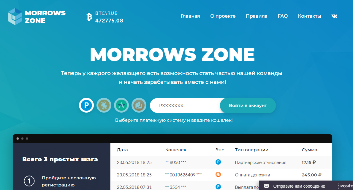 Описание: ИНФА КОПИПАСТ. Скрипт удвоителя Morrows Zone. уникальный в своем роде удвоитель. в арсенале имеет 4 платежной системы, после покупки лицензии вы получите красивый скрипт сайта удвоителя. помощь в установке в наборе, установка бесплатная. в архиве дополнительная инфа