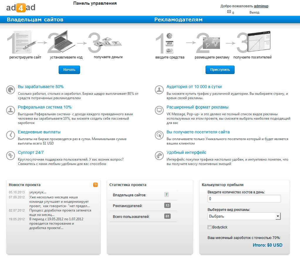 Описание: Скрипт представляет собой систему продажи и покупки интернет трафика, по самым популярным на данный момент форматам VK message, Popup, Bodyclick, Slider, Media Youtube. Интегрированный платёжные системы WebMoney и Интеркасса. Требование к хостингу: PHP5.2, от 100 мегабайт свободного места с возможность увеличения, MySQL. Установка: Описание.txt