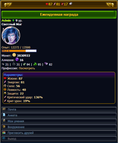 Описание: Описание: Двиг Битва героев 1) Новый дизайн 2) Без дыр 3) Новый магазин по типу вещи а не комплектах 4) Ежедневные задания 5) Обучение новичков 6) Ежедневный подарок за вход по количеству для увеличивая награжу (Цикл 5 дней) 6) Автопокупка алмазов 7) Переработаный зал славы (+ админы в рейтинге не отображаютса) 6) Всякие мелочи!