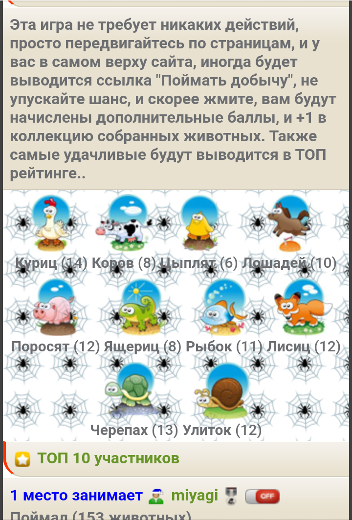 Описание: Игра Моя добыча или как её называют Скотный двор) Тут её не видел, и решил выложить) Эта игра не требует никаких действий, просто передвигайтесь по страницам, и у вас в самом верху сайта, иногда будет выводится ссылка "Поймать добычу", не упускайте шанс, и скорее жмите, вам будут начислены дополнительные баллы, и +1 в коллекцию собранных животных. Также самые удачливые будут выводится в ТОП рейтинге.. Файл на продажу добычу, я вложил здесь: https://bymas.ru/downloads/view/78568 ) Ps: Readmi Моя добыча внутри) Пользуйтесь на здоровье)