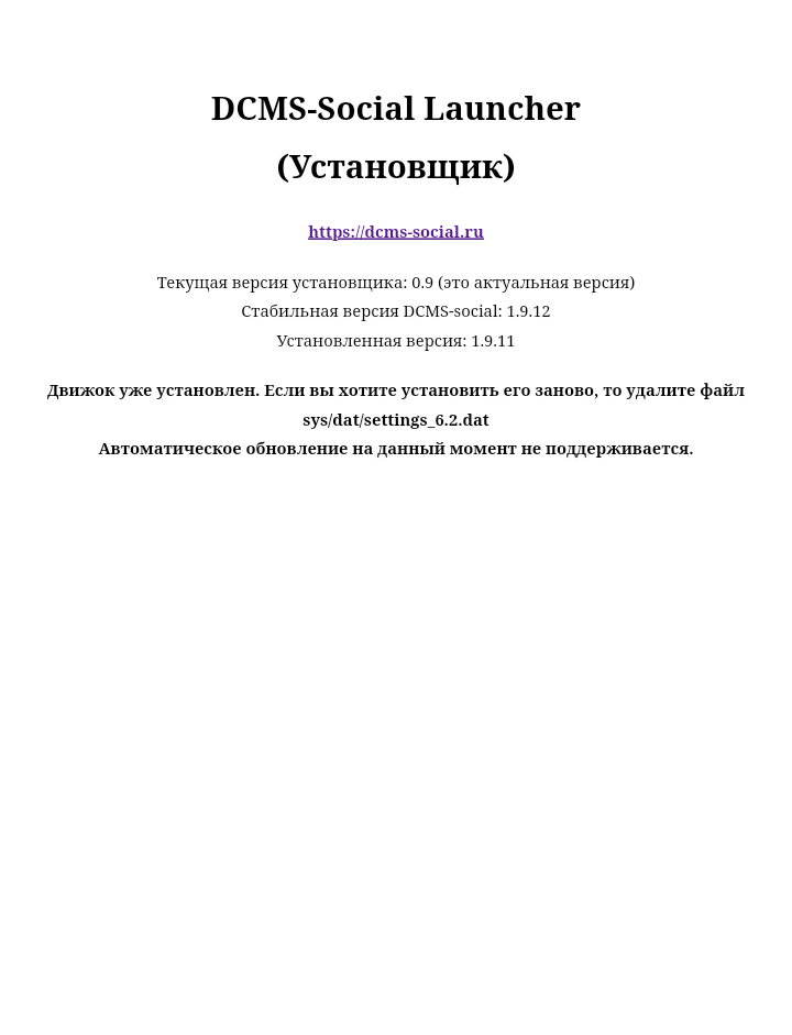 Описание: Быстрое скачивание последней актуальной версии DCMS-Social 1. Распаковать launcher.php в корень сайта 2. Перейти по адресу ВАШ_САЙТ/launcher.php 3. Нажать "Скачать" возле нужной версии