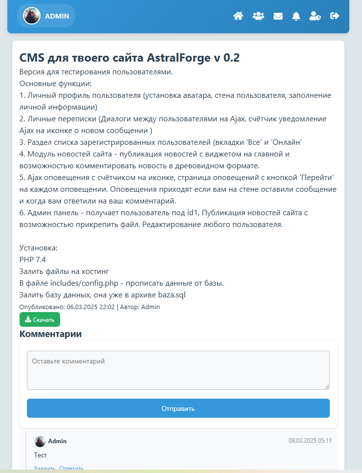 6. Админ панель - получает пользователь под id1, Публикация новостей сайта с возможностью прикрепить файл. Редактирование любого пользователя.