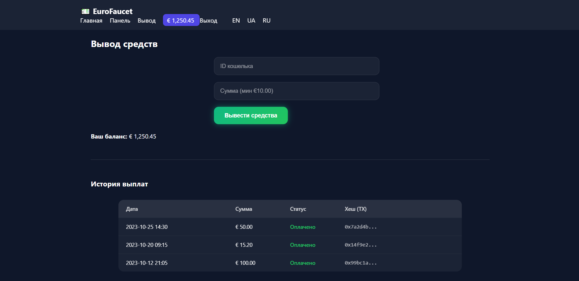 Описание: EuroFaucet — это программное решение на базе PHP, предназначенное для организации автоматической раздачи денежных бонусов или вознаграждений. Система сочетает в себе функции бонусного крана, игровой механики (рулетки) и партнерской программы.