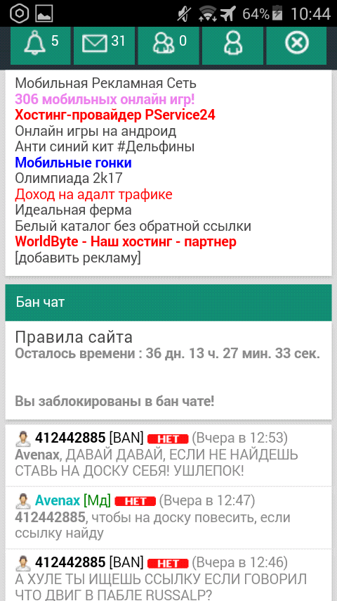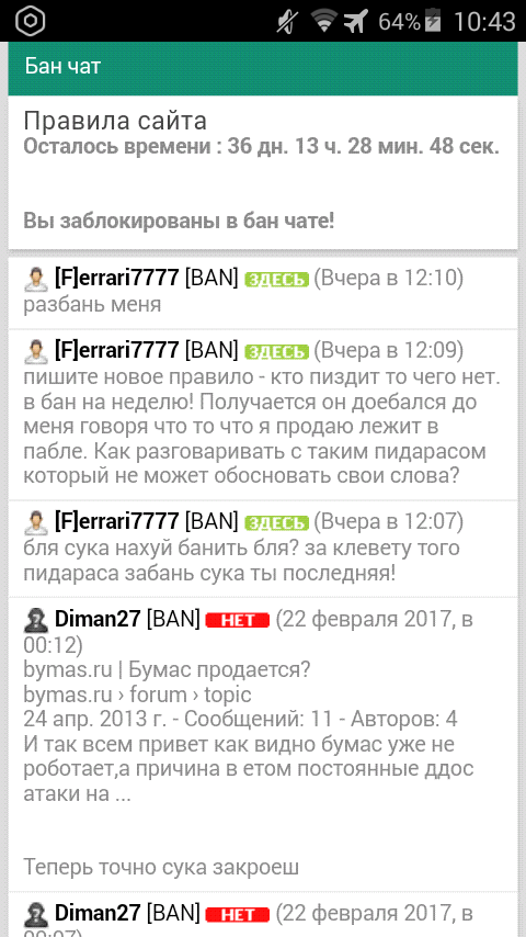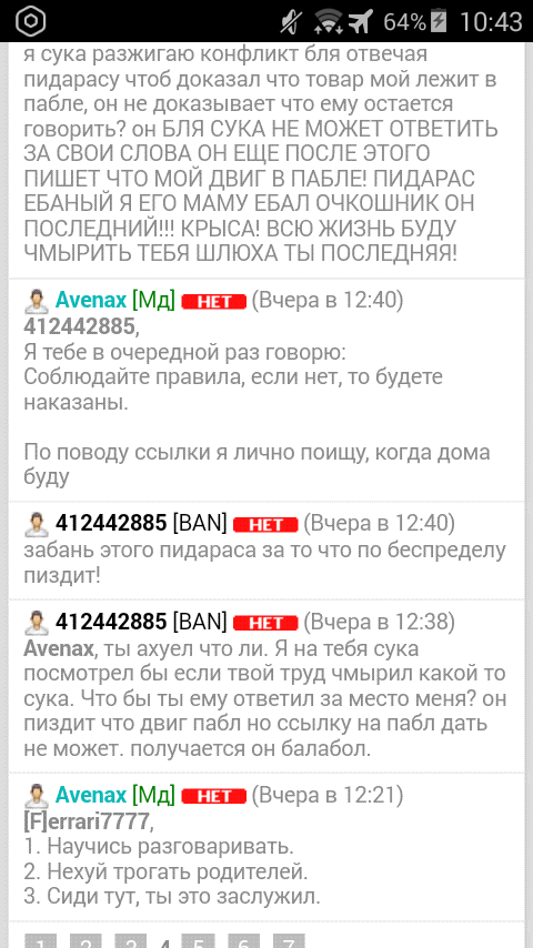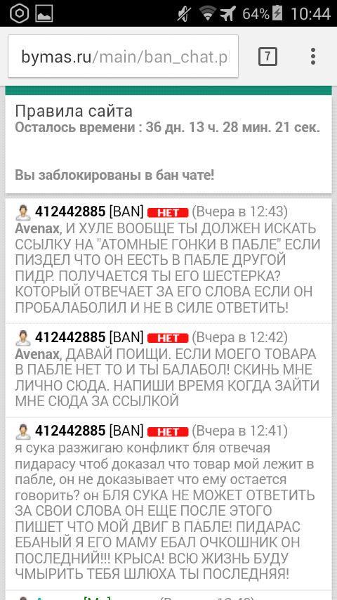 Здаров, парни. Тут такое дело: Забанили на 36 суток (в общем на 37-38) За то что наехал на пацана который необоснованно называет мой товар паблом. Но не доказывает это, после чего я его называю балаболом. Полетел в бан я, он пока еще сидел и троллил других заставляя матернуться на него и чтоб в бан загонять, правда крыса? жалуется на комы. По мне это последний поступок пацана. Ник его Russalp, за него впрягся админ, якобы поставит на доску, если найдет ссылку
