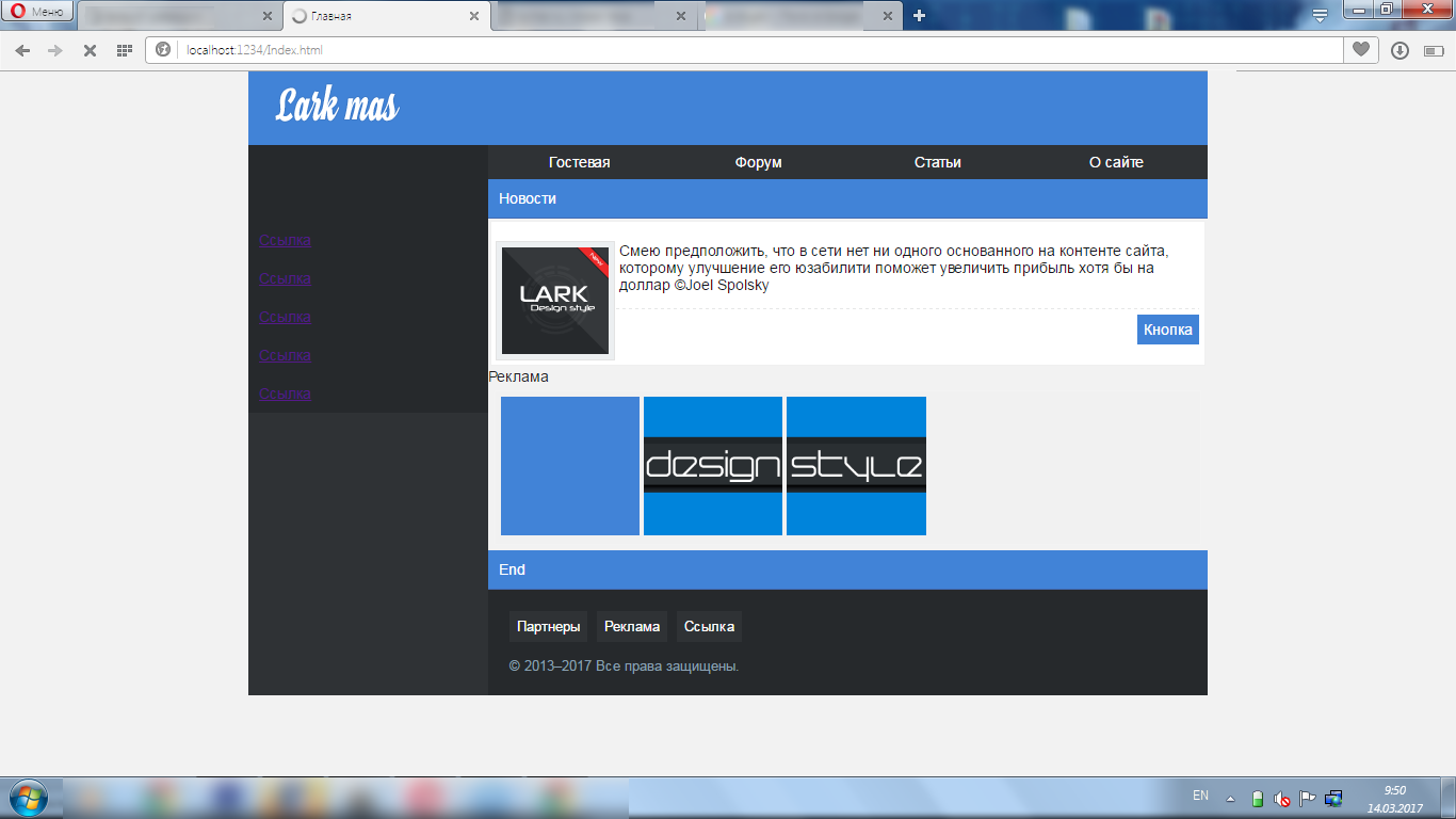 В общем это только начало)) застрял на боковом меню, не могу подобрать цвет, нужно чтоб и ссылки было видно и чтоб особо на фоне всего остального не выделялось. Кто что предложит?