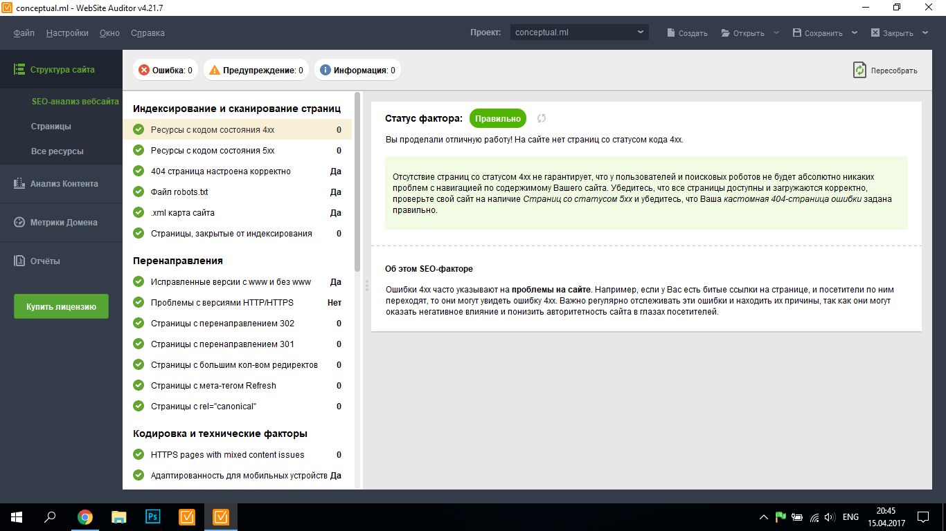Это профессиональная СЕО программа, которая показывает, что на сайте нет ни одной ошибки .45.