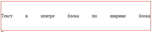 <style> #justify { text-align: justify; width: 500px;/*ширина блока для примера*/ height: 100px;/*высота блока для примера*/ display: table-cell; vertical-align: middle; border: 1px solid red;/*граница блока, чтобы видеть пример*/ } #justify:after { content: ""; display: inline-block; width: 100%; } </style> <div id="justify"> Текст в центре блока по ширине блока </div>