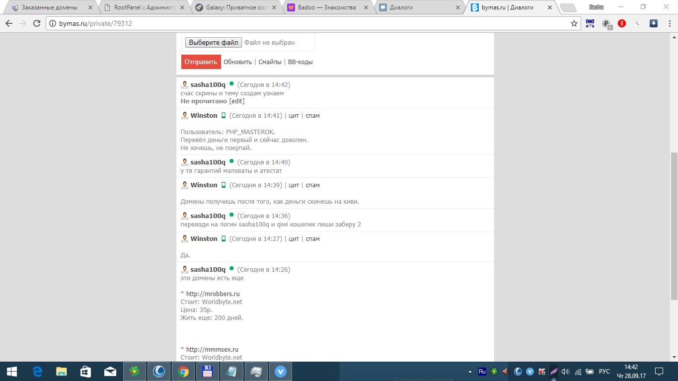 вообщем хотел купить у юзера 2 домена сказал переводить первый гарантий мне его смутили и сразу удалил с друзей бдим