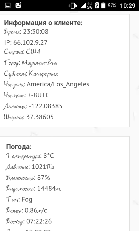 Выводить погоду по ip адресу, такая себе идея, у меня, например, показывает соседний регион, да и информация об устройстве так же ни к чему + она показала что у меня глубина цвета 24 бит, при 32-ух