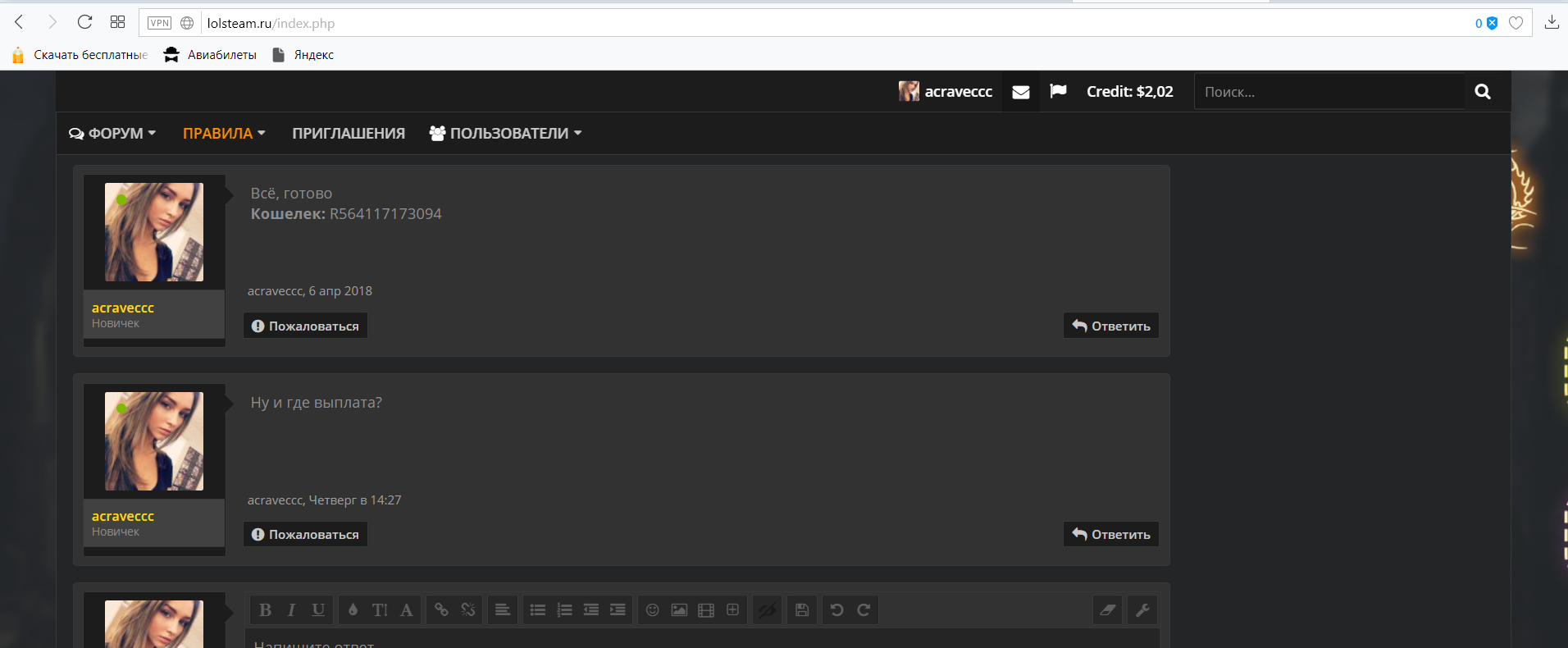 Ещё как только автор создал тему решил проверить, насколько честно автор платит деньги. За час набил 2 бакса. Заказал выплату. Автор выводил две недели, потом снёс базу и сказал мол если тем нету, то и денег нету. Ну думаю ладно, попробую ещё раз. Набил опять 2 бакса. Прошло более 2-х недель, выплаты нету, автор игнорит!