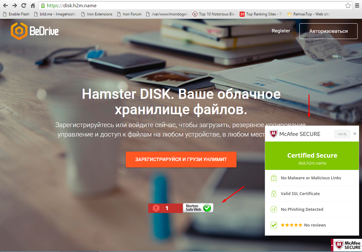 Облако подлючено к Антивирусным системам Norton и MsAfee SECURE