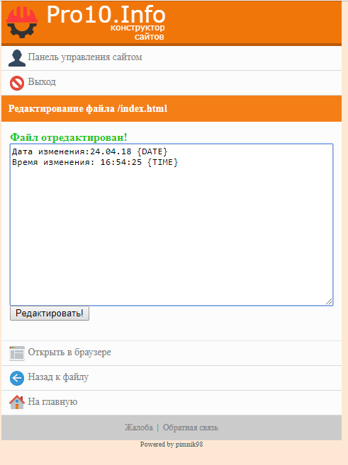 И 2 тега для него, те если вы хотите вывести время сохранения файла (допустим там будет статья) то пишем {TIME}, и {DATE} для даты