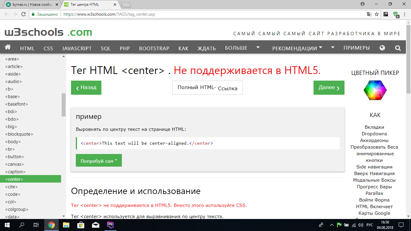 прежде, чем говорить спасибо, то нужно знать, что тег <center> устарел с версии html 4.01 и больше не используется, поэтому нужно использовать css