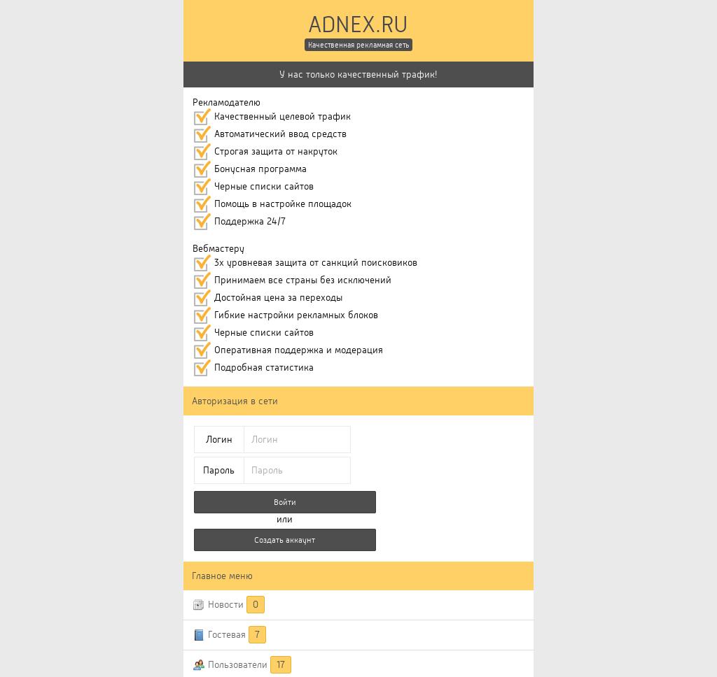 https://adnex.ru - это качественная рекламная сеть. Где вы в едином аккаунте можете, как покупать рекламу так и продавать ее на своем сайте. Мы принимаем сайты с любой посещаемостью.