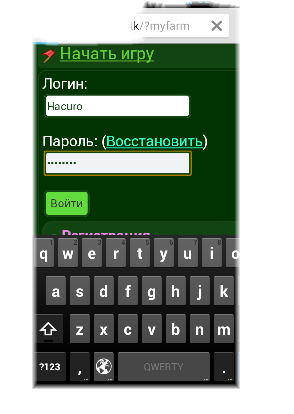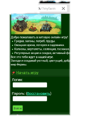 Скрин 2; ввожу лог и пароль, нажимаю войти, и как видно на скрине 3 не чего не произошло, но в адресной строке видно что меня кинуло на грядки(?myfarm)