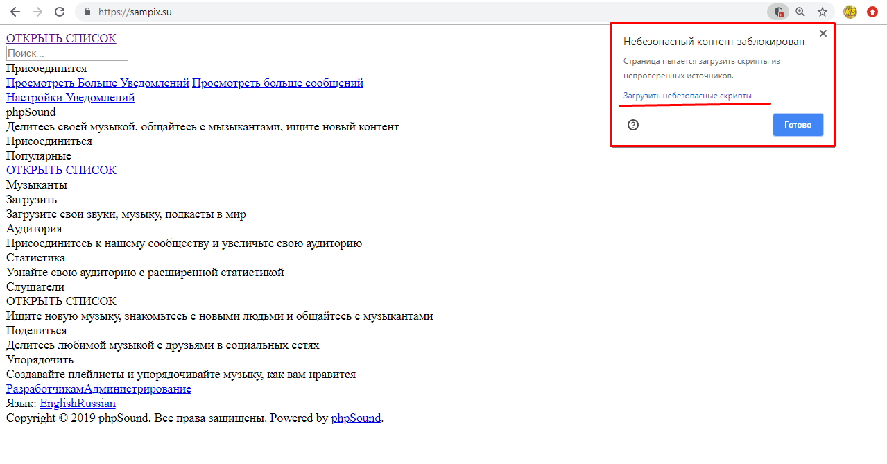 И когда жму загрузить небезопасные скрипты то получаю полностью загруженный сайт но,