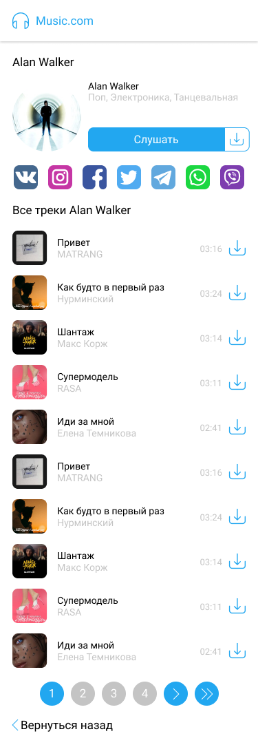 Экран карточки артиста, плейлиста. Социалки будут выглядеть по-другому, бесит навигация и кнопка «Домой», над ними буду еще думать.