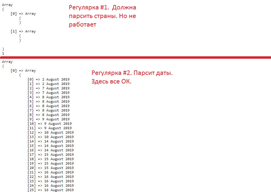Первая должна парсить страны, а вторая даты. Но первая что то не срабатывает.