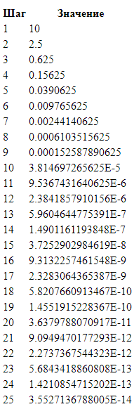 <table> <tr> <th>Шаг</th> <th>Значение</th> </tr> <? $i = 1; for ($var = 10; $i < 26; $var = ($var / 4)) { ?> <tr> <td><?=$i?></td> <td><?=$var?></td> </tr> <? $i++; } ?> </table> ------