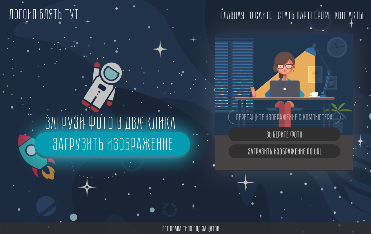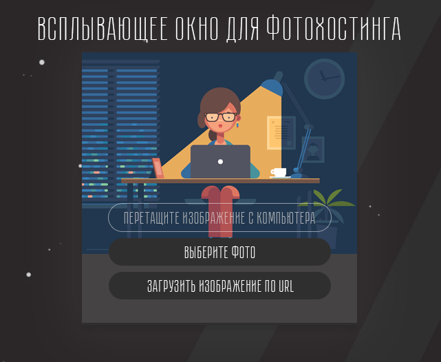 Просто будет главная а на ней описание и ниже кнопка "Загрузить изображение" и когда человек жмет кнопку, то всплывает это окно, где он выбирает каким способом будет загружать картинки на фотохостинг.