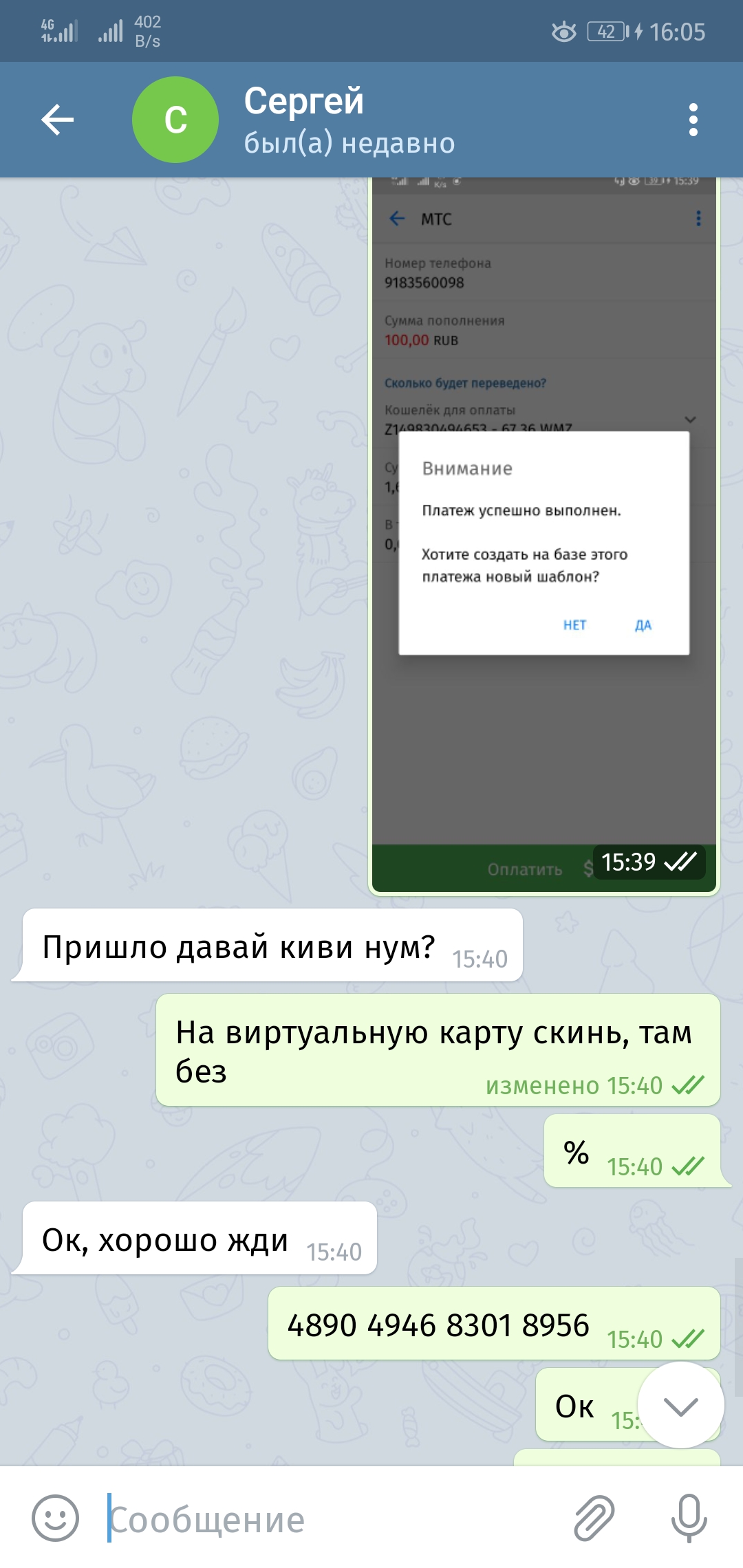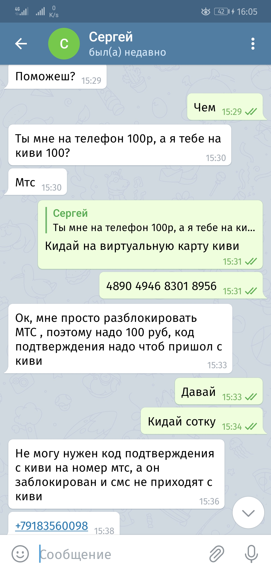 Потом, через 20минут он попросил помочь, скинуть ему 100р на номер, а он мне на киви, обмен мне не нужен был вообще, но решил ему помочь, сказал, мол у него номер заблокирован и что он не может первым скинуть, понятно стало, что он едрить. Но всё таки скинул ему сотку, сумма то небольшая, не кинет, так и думал я, но чел слился просто. Не стал ему звонить на этот номер, в тг не брал. Просить вернуть сотку пр телефону 8 летнему мальчику очень низко, пусть себе смузи купить, мозг попробует развивать