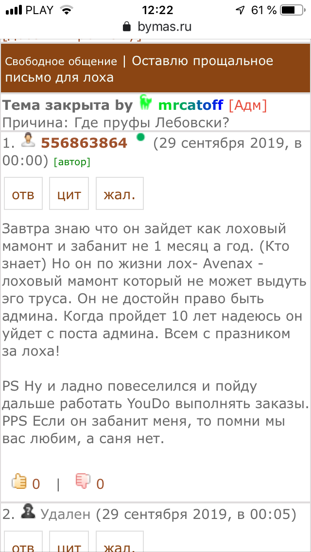 Причина: ЛАДНО, крою тему, а то ОФФтопа много. А те Витя скажу так: "ЗВЕЗДУЙ ЖАЛУЙСЯ В ТП ВАРГЕЙМА, во первых как крысёныш, во вторых потом скажешь как НА ЙУХ сходил