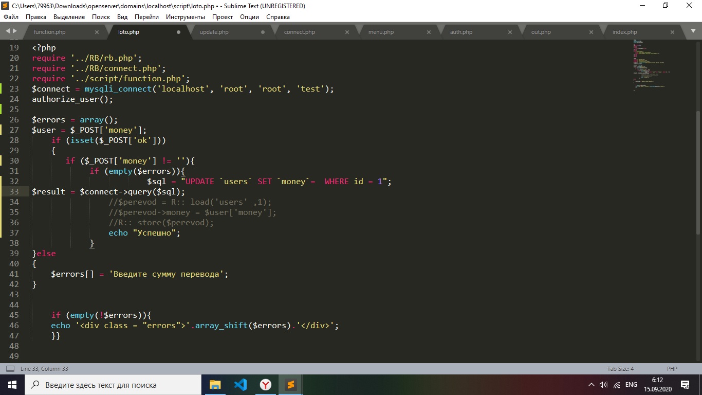 нужно изменить данные через форму, имеется поле ввода (money), подправьте пожалуйста запрос, что бы введённое число записывалось в бд, человеку который вводит сумму