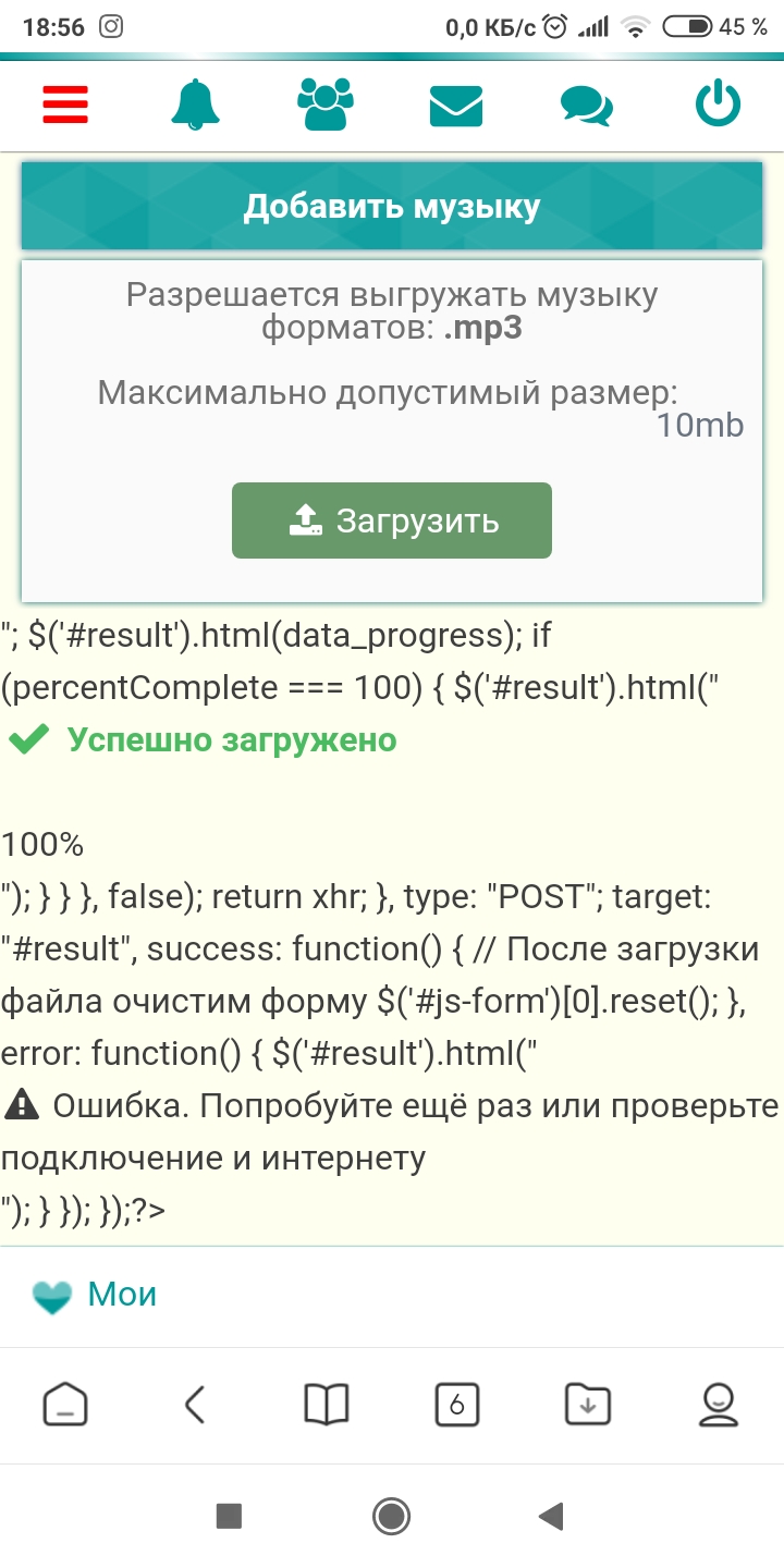 CLASS FILE{ /* --------------------------------------- Загрузка файла --------------------------------------- */ PUBLIC STATIC FUNCTION UPLOAD($name = 'Выберите файл', $form = 1, $class = 'file-upload', $icon = 'upload') { GLOBAL $user; //$path - путь обращения к обработчику //$name - описание выгрузки //$form - использование собственной формы отправки //$class - стиль кнопки //$icon - иконка кнопки ?> <? IF ($form == 1){ ?> <form id="js-form" method="post" enctype="multipart/form-data"> <? } ?> <label class='file-label'><span class="<?=$class?>"> <input id="js-file" type="file" name="file" class="file-form" multiple> <span><i class="fa fa-<?=$icon?> fa-fw"></i> <?=$name?></span> </span></label> <? IF ($form == 1){ ?> </form> <? } ?> <div id="result"></div> <script> $('#js-file').change(function() { $('#js-form').ajaxSubmit({ xhr: function() { var xhr = new window.XMLHttpRequest(); xhr.upload.addEventListener("progress", function(evt) { if (evt.lengthComputable) { var percentComplete = evt.loaded / evt.total; percentComplete = parseInt(percentComplete * 100); var data_progress = "<div class='file-upload-progress'><i class='fa fa-spinner fa-pulse fa-lg fa-fw'></i> <b>Загрузка...</b><br /><br /><div class='file-upload-progress-ind-o'><div class='file-upload-progress-ind' style='width:"+percentComplete+"%;'><span class='file-upload-progress-pr'>"+percentComplete+"%</span></div></div></div>"; $('#result').html(data_progress); if (percentComplete === 100) { $('#result').html("<div class='file-upload-progress'><font color='#4BBB62'><i class='fa fa-check fa-lg fa-fw'></i> <b>Успешно загружено</b></font><br /><br /><div class='file-upload-progress-ind-o'><div class='file-upload-progress-ind-green' style='width:100%;'><span class='file-upload-progress-pr'>100%</span></div></div></div>"); } } }, false); return xhr; }, type: "POST"; target: "#result", success: function() { // После загрузки файла очистим форму $('#js-form')[0].reset(); }, error: function() { $('#result').html("<div class='file-upload-progress'><i class='fa fa-exclamation-triangle fa-fw'></i> Ошибка. Попробуйте ещё раз или проверьте подключение и интернету</div>"); } }); }); </script> <? } } PasichNIK (15.10.2020 в 20:00)