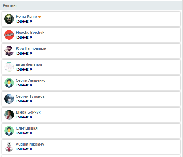 echo '<div class="title">Рейтинг</div>'; $all = $mysqli->query("SELECT `id` FROM `users`")->num_rows; if ($all > 0) { $cp = ceil($all/10); $p = (isset($_GET['p']) and is_numeric($_GET['p']) and $_GET['p']>1 and $_GET['p']<=$cp) ? $_GET['p'] : 1; $start = $p*10-10; $res = $mysqli->query("SELECT * FROM `users` ORDER by `coins` DESC LIMIT $start,10"); while ($array = $res->fetch_array()) echo '<div class="block">'.user_name($array['id']).'<br>Коинов: 0</div>'; navi($p,$cp,'/root/coins.php?'); }