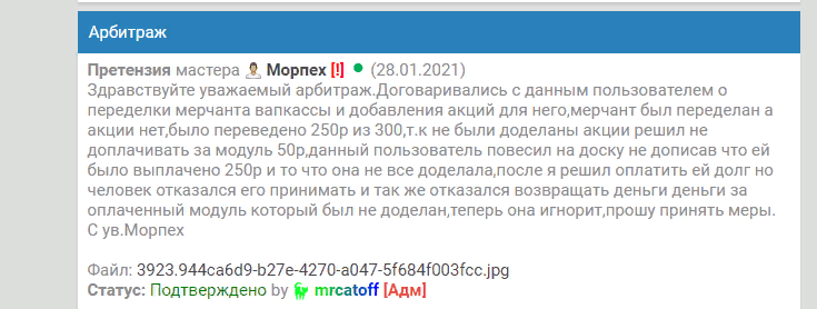 У данного пользователя https://bym.guru/id85823 был заказан модуль переделка мерчанта вапкассы и добовления акций,мерчан был переделан а акции сделаны не были(заказ был на 300р,выплачено было 250р,50р не было выплачено из-за того что модуль не был доделан полностью,я написал ей что давай верну деньги остаток чтоб все решить по хорошему,человек отказался от долга,так же я попросил ее вернуть мне 250р за не доделанный модуль и вернуть ей этот модуль,человек не хочет возвращать и брать модуль.Уважаемая Администрация прошу повесить данного пользователя на доску!За не возврат средств мне за не доделанный модуль.(Все доки в этой теме https://bym.guru/forum/topic/148247 так же предастовляю ее модуль в доказательство того что он не был доделан,прошу снять меня потому что данный пользователь обманом повесил на доску!(Не флудить и ни кого не оскор мат в теме,будет бан).