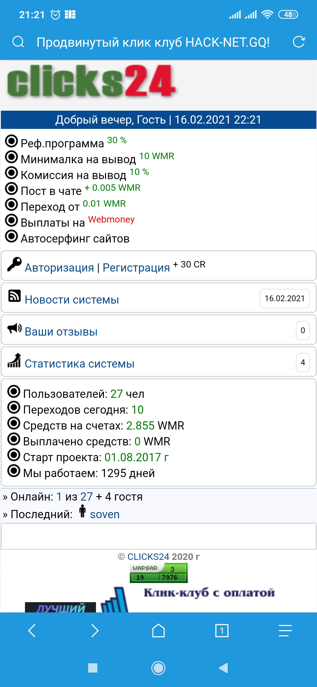 Взял на этом говнохостинге хостинг за 65 р, 3 тестовых дня проработал норм, за это время успел закинуть 6$ на полгода вперед. и что теперь? вместо мого сайта Hack-Net.gq какой то клик клуб. Переежаю на другой хостинг, а этот не советую!