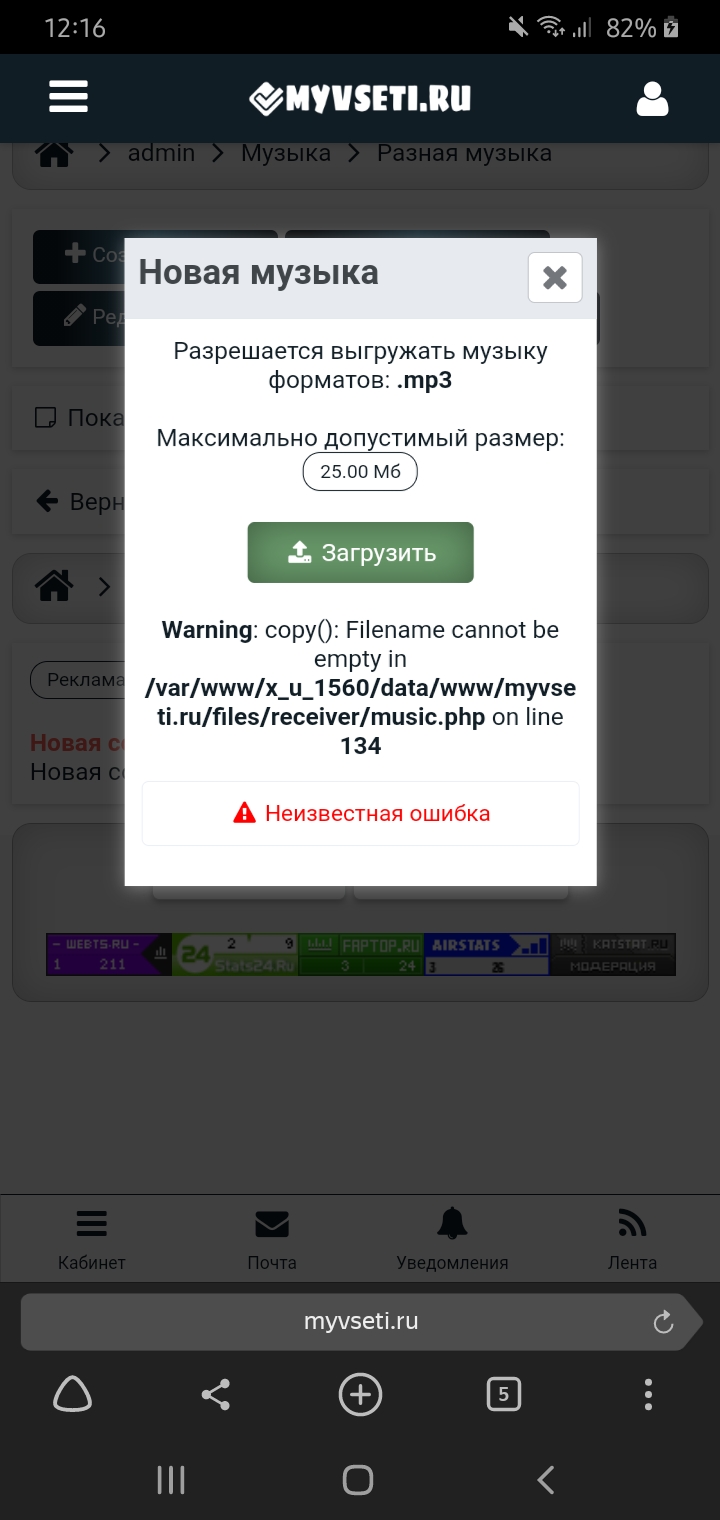 Всем привет такая ошибка, загружаю музыку на сайт выдает такую ошибку.