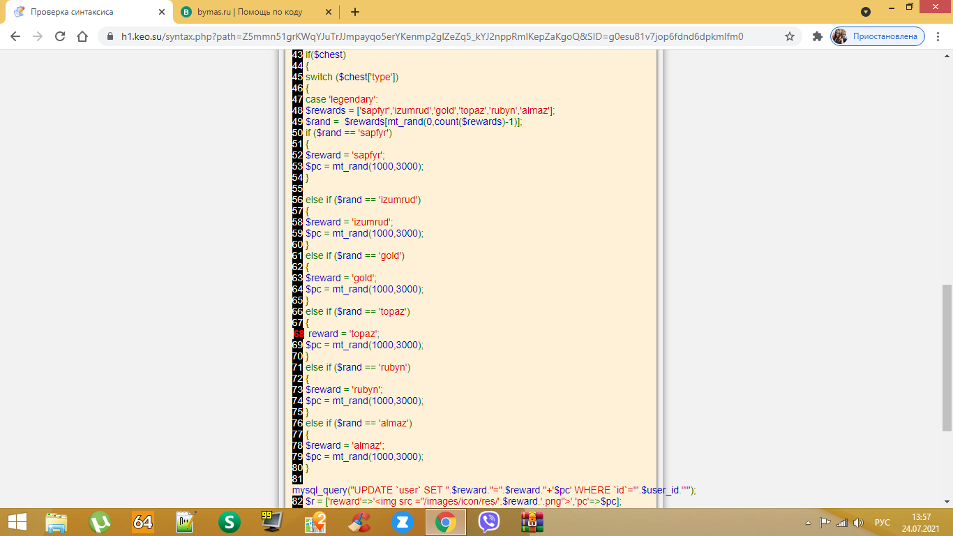 <? function haveChests($user_id) { $db = Elfi::getInstanse(); $count = $db->count("SELECT `id` FROM `chests_user` WHERE `user_id`=%d",[$user_id]); return $count; } function getChests($user_id) { $db = Elfi::getInstanse(); $data = $db->query("SELECT * FROM `chests_user` WHERE `user_id`=%d",[$user_id]); $data = mysql_fetch_assoc($data); return $data; } function getChestInfo($chest_id) { $db = Elfi::getInstanse(); $data = $db->fetch("SELECT * FROM `chests` WHERE `id`=%d",[$chest_id]); return $data; } function giveChest($user_id,$chest_id) { $db = Elfi::getInstanse(); if ($db->query("INSERT INTO `chests_user` SET `user_id`=%d,`chest_id`=%d,`time`=%d",[$user_id,$chest_id,time()])) { return true; } return false; } function canOpenThis($id,$user_id) { $db = Elfi::getInstanse(); if ($db->count("SELECT `id` FROM `chests_user` WHERE `id`=%d and `user_id`=%d",[$id,$user_id]) == 1) { return true; } return false; } function openThis($id,$user_id) { $myChest = mysql_fetch_assoc(mysql_query("SELECT * FROM `chests_user` WHERE `id`='".$id."' and `user_id`='".$user_id."'")); $chest = mysql_fetch_assoc(mysql_query("SELECT * FROM `chests` WHERE `id`='".$myChest['chest_id']."'")); if($chest) { switch ($chest['type']) { case 'legendary': $rewards = ['sapfyr','izumrud','gold','topaz','rubyn','almaz']; $rand = $rewards[mt_rand(0,count($rewards)-1)]; if ($rand == 'sapfyr') { $reward = 'sapfyr'; $pc = mt_rand(1000,3000); } else if ($rand == 'izumrud') { $reward = 'izumrud'; $pc = mt_rand(1000,3000); } else if ($rand == 'gold') { $reward = 'gold'; $pc = mt_rand(1000,3000); } else if ($rand == 'topaz') { reward = 'topaz'; $pc = mt_rand(1000,3000); } else if ($rand == 'rubyn') { $reward = 'rubyn'; $pc = mt_rand(1000,3000); } else if ($rand == 'almaz') { $reward = 'almaz'; $pc = mt_rand(1000,3000); } mysql_query("UPDATE `user` SET ".$reward."=".$reward."+'$pc' WHERE `id`='".$user_id."'"); $r = ['reward'=>'<img src ="/images/icon/res/'.$reward.'.png">','pc'=>$pc]; eleteChest($id); return $r; break; } } } function deleteChest($id) { mysql_query("DELETE FROM `chests_user` WHERE `id`='".$id."'"); return true; } ________