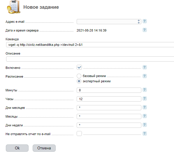 это крон)) выполнение раз в 12 часов))) wget -q http://civilz.net/banditka.php >/dev/null 2>&1 это команда, а 0 12 * * * это настройки времени в экспертном режиме
