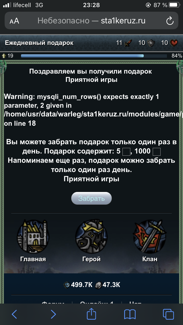 <?php require '../../system/func_for_game2.inc.php'; head('Ежедневный подарок'); $gift = mysqli_fetch_assoc(mysqli_query($link,"SELECT * FROM `user_podarok` WHERE `user_id` = '$user[id]' order by `last_auth` desc limit 1")); $time = $gift['last_auth'] + 86400; $now = time(); echo "<table class='post'>"; if(isset($_GET['take'])){ if ($time < $now) { echo "<div class='block_light'><center><b>Поздравляем вы получили подарок <br><span class='green'>Приятной игры</span></center></div>"; mysqli_query($link,"UPDATE `users` SET `gold` = `gold` + '5' WHERE `id` = '$user[id]'"); mysqli_query($link,"UPDATE `users` SET `money` = `money` + '1000' WHERE `id` = '$user[id]'"); mysqli_query($link,"UPDATE `user` SET `health` = `health` + '0' WHERE `id` = '$user[id]'"); $rows_c = mysqli_query($link,"SELECT count(user_id) from `user_podarok` where `user_id` = '".$user['id']."'"); if(mysqli_num_rows($link, $rows_c) == 0) { mysqli_query($link,"INSERT INTO `user_podarok` SET `last_auth` = '$now', `stage` = '1', `user_id` = '$user[id]'"); }else{ mysqli_query($link,"UPDATE `user_podarok` SET `last_auth` = '$now', `stage` = `stage` + '1' WHERE `user_id` = '$user[id]'"); } } else { echo "</br></br>"; } } if ($time < $now) { echo "<center><b><br>Вы можете забрать подарок только один раз в день. Подарок содержит: 5 <img width='16' height='16' src='images/icon/gold.png' alt='o'>, 1000 <img width='16' height='16' src='images/icon/silver.png' alt='o'><br>Напоминаем еще раз, подарок можно забрать только один раз день.<br><span class='green'>Приятной игры</span></b><br /> <form action='podarok.php?take' method='post'><br/> <center><span class='btn'><span class='end'><input class='label' type='submit' name='take' value='Забрать'/> </form></center>"; } else { $hour_t = ceil(($time - $now) / 3600); $min = ceil(($time - $now) / 60); if ($hour_t == 1 or $hour_t == 21) { $hour = 'час'; } elseif ($hour_t >= 2 and $hour_t <= 4 or $hour_t >= 22 and $hour_t <= 24) { $hour = 'часа'; } elseif ($hour_t >= 5 and $hour_t <= 20) { $hour = 'часов'; } echo "<center><b>Вы уже получали сегодня свой подарок.</br>Приходите через: <span class='green'>$min</span></b> мин.</b></centet><br><br>"; } echo "</table>"; foot(); ?>