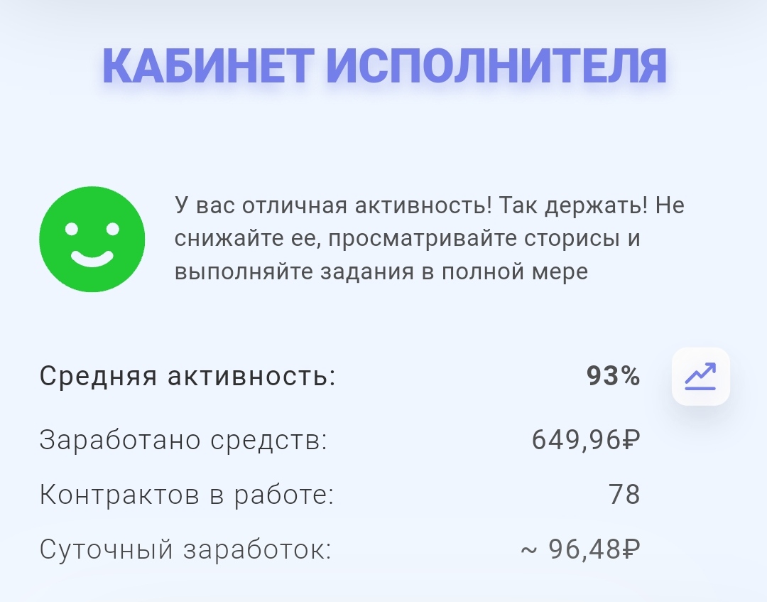 Вам больше не нужно каждый день заходить на сайт и мониторить новые задания. Их попросту нет! Вместо этого, вам предлагают подписаться на заказчика (заключить контракт) и проявлять активность на его странице. Все контракты долгосрочные (минимум на 5 дней). Для стабильного заработка, вам не придется ежедневно подписываться на новых заказчиков и отписываться от старых. За каждый день, который вы подписаны на заказчика, начисляется оплата от 1 до 5 рублей. Сумма оплаты зависит от типа контракта, который вы заключили (Active или Super Active), а также от сложности страницы заказчика. Контракт Active предполагает выполнение следующих условий: просмотр всех сторис и отметки Like на новых публикациях. Контракт Super Active отличается тем, что кроме просмотра сторис и лайков, необходимо писать комментарии. Чем выше сложность страницы заказчика (количество ежедневно публикующихся постов), тем большую прибыль вы получаете.