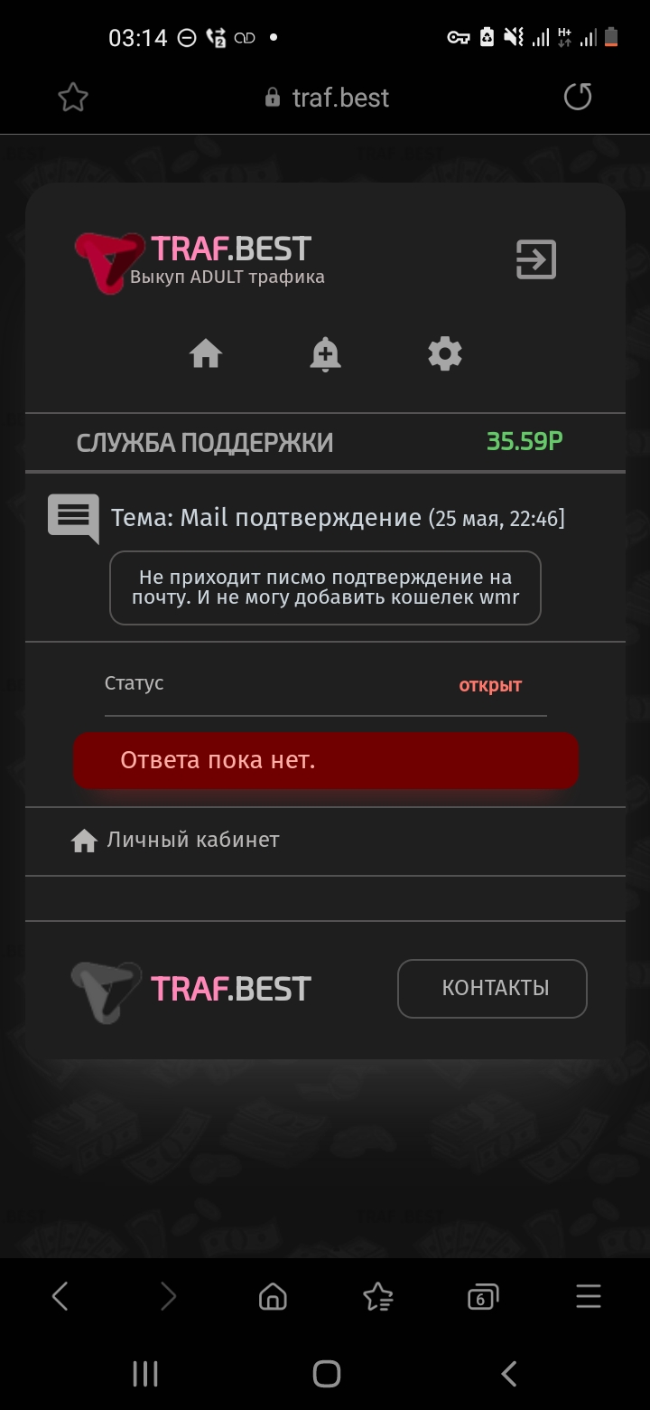 Ты че всем будешь весить кто не ответил в тикет по скрину? Вообще, то арбитаж за кидло.. 3 года работал TRAF.BEST. Всем стабильно были выплаты, один раз подтянул накрутчика, так сразу на меня всех вешать? накрутчик который по машонке...