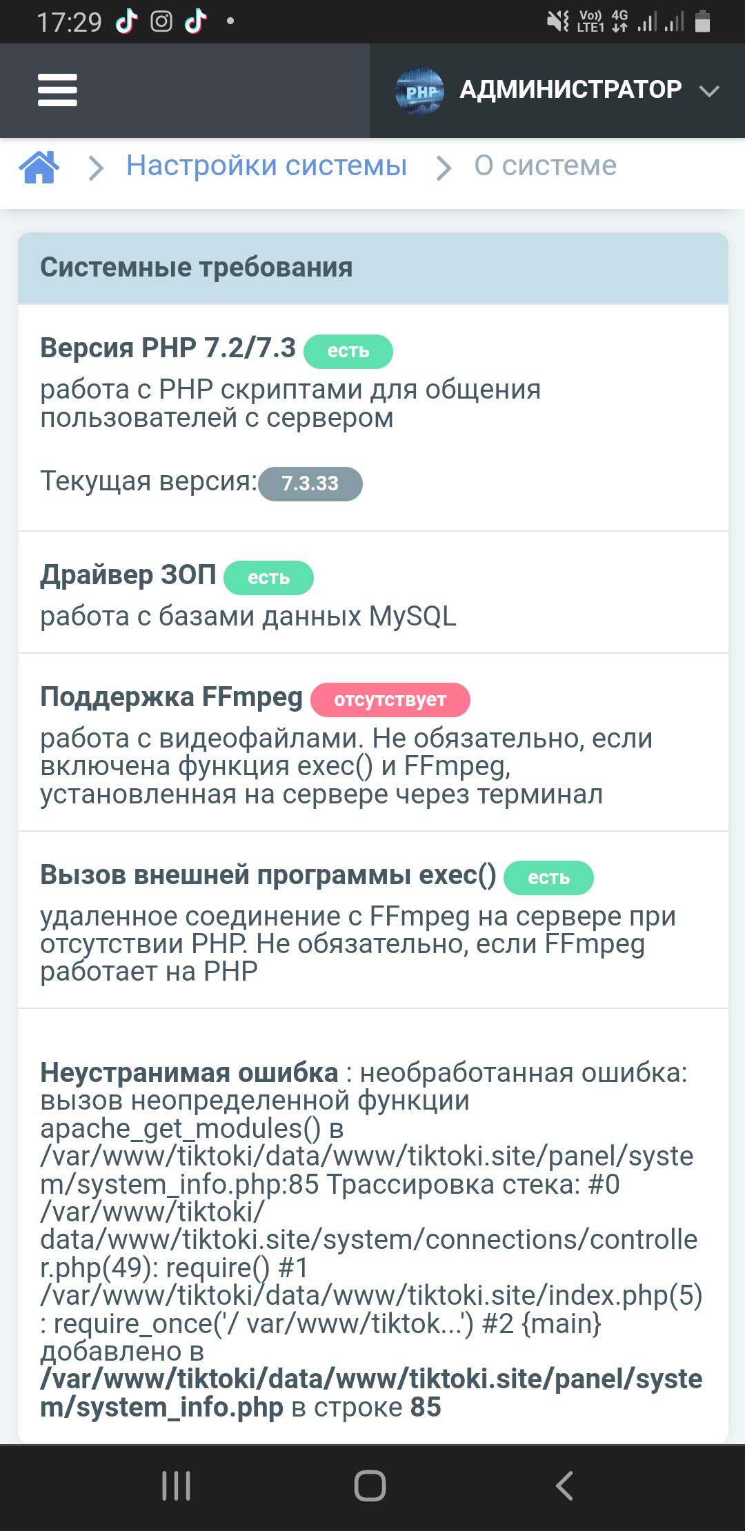 Fatal error: Uncaught Error: Call to undefined function apache_get_modules() in /var/www/tiktoki/data/www/tiktoki.of/panel/system/system_info.php:85 Stack trace: #0 /var/www/tiktoki/data/www/tiktoki.of/system/connections/controller.php(49): require() #1 /var/www/tiktoki/data/www/tiktoki.of/index.php(13): require_once('/var/www/tiktok...') #2 {main} thrown in /var/www/tiktoki/data/www/tiktoki.of/panel/system/system_info.php on line 85
