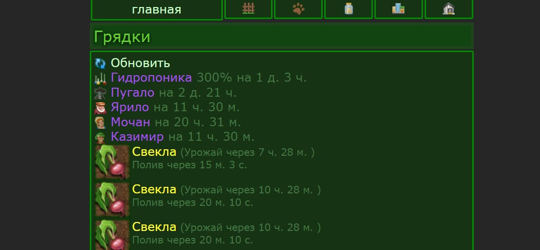 Поставил садовников. Изначально был только ярило. Прописал все по инструкции. Но при покупке другого садовника, старый из списка на главной не исчезает почему-то. Полазил по коду. Нашел эту строчку. Внес туда еще двух садовников И теперь все они отображаются на главной с одинаковым временем, хотя по идее должен быть один, а остальные должны исчезать. Что я не правильно сделал? Вот сам скрипт что ставил.