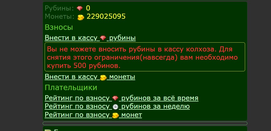 { $err=1; err_game("Вы не можете вносить рубины в кассу колхоза. Для снятия этого ограничения(навсегда) вам необходимо купить $c рубинов."); } ------