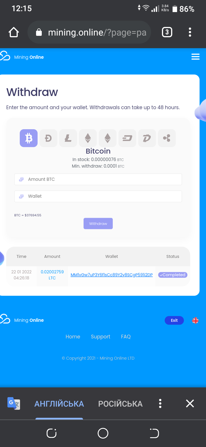 Так вот вывод пришёл, и я советую вам не терять время, после регистрации выберите КРИПТУ запустите майнинг и усе! Ждём когда накапает минималка и выводим!