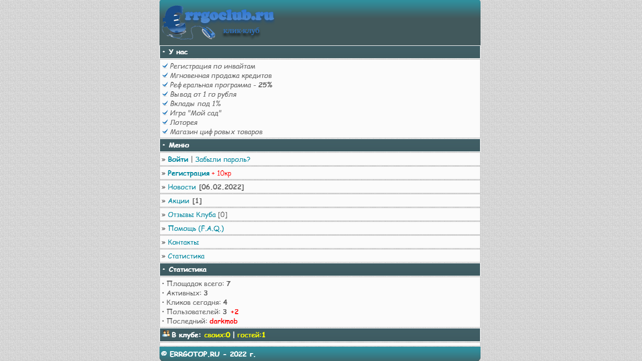 Приглашаю в закрытый клик клуб. Рега исключительна по инвайтам. За приглашением в личку или же на мыло письмо support@errgotop.ru . Клуб работает, но время его не пощадила, поэтому ведётся доработка по вводу и выводу средств. Диз останется таким каким есть, поэтому прошу не парить насчёт него)