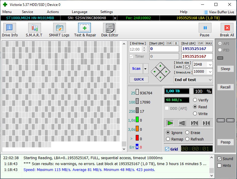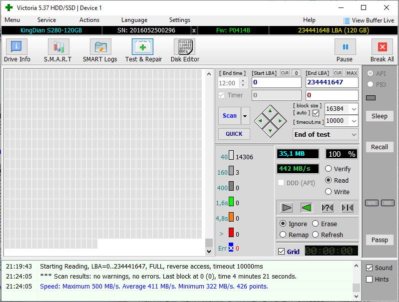 Ivangg , я так же посоветовал владельцу SSD так как у меня такой и хорошо справляется вот провёл тесты своего SSD и того HDD вродь нету критичных ошибок
